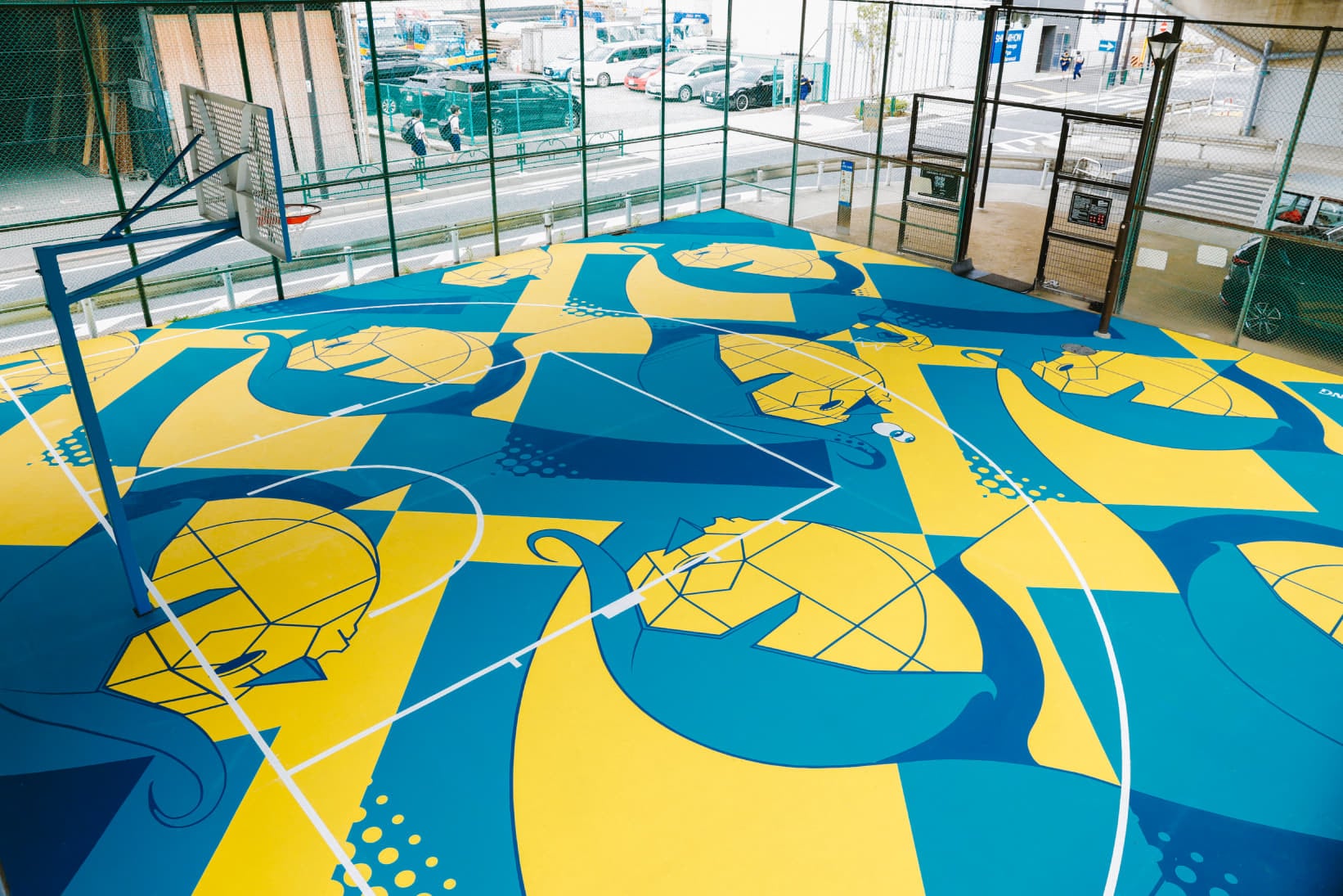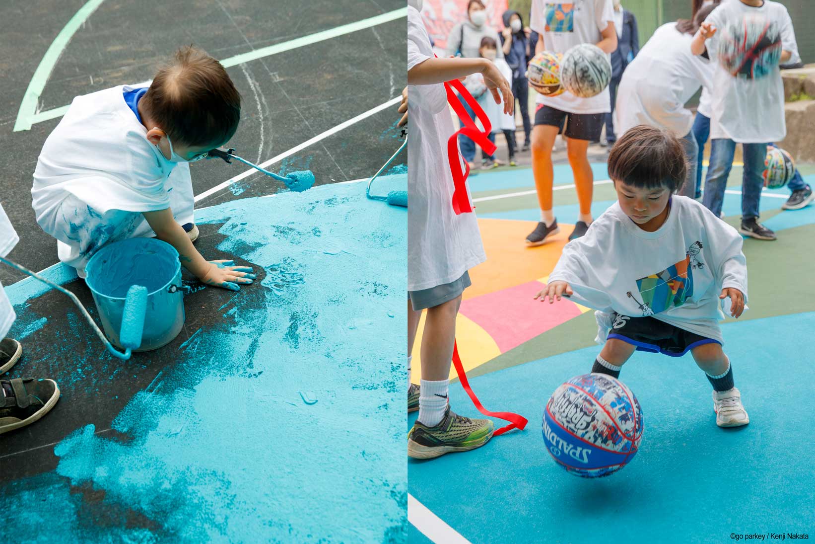 仕掛け人”go parkey“、アーティスト”今井俊介氏“、そして”スポルディング“のタッグによって、経年劣化が見えていたバスケットコートがアートコートとして新たな息吹を吹き込まれました